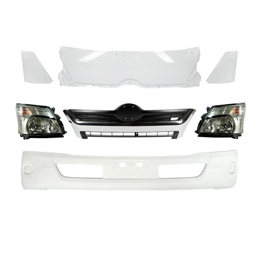 HinoFit: Hino 195/155 2012-2021 DOT Certified Grille: Painted Black and chrome with OEM color code Pannels: Painted white with the OEM color code Headl...